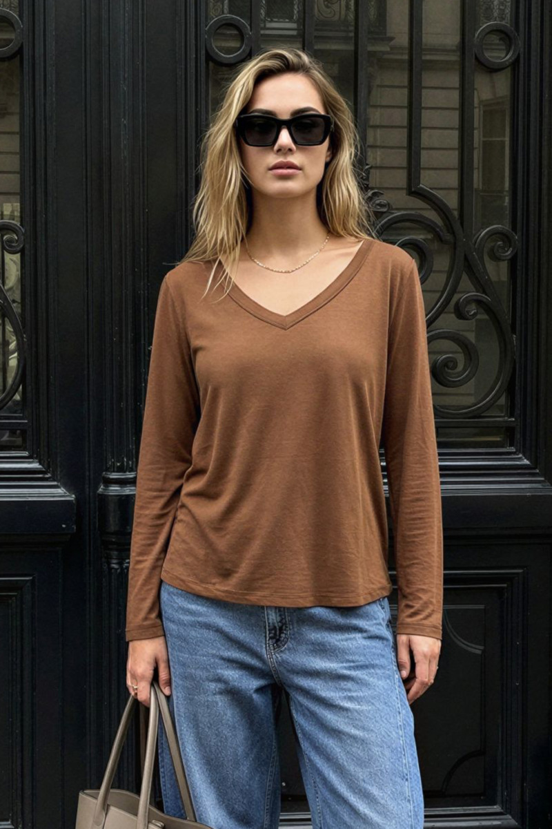 Está confeccionada en viscosa con elastano, una combinación de tejidos que garantiza gran suavidad al tacto, excelente caída y la elasticidad necesaria para adaptarse al movimiento sin perder la forma. Es una prenda básica, funcional y muy versátil para sumar a tus conjuntos diarios