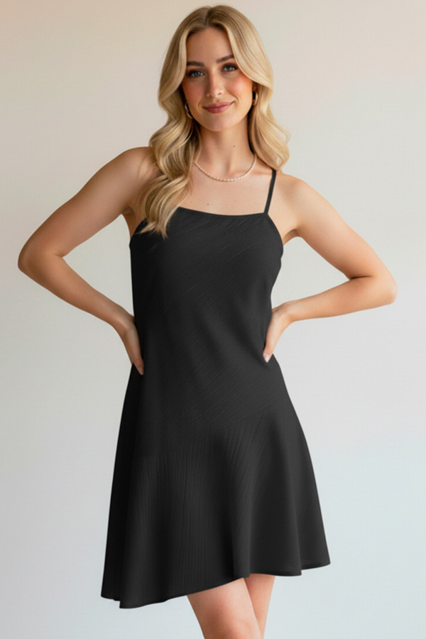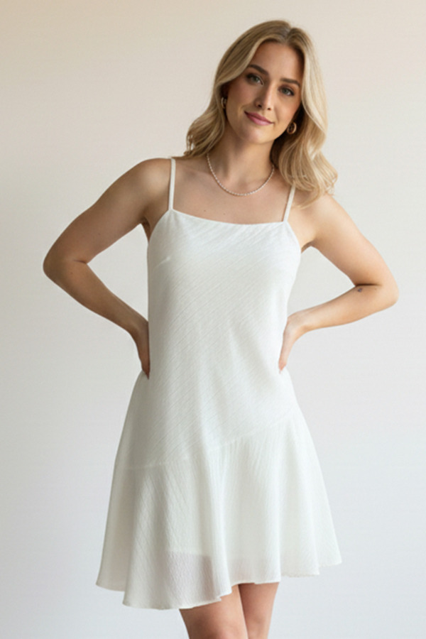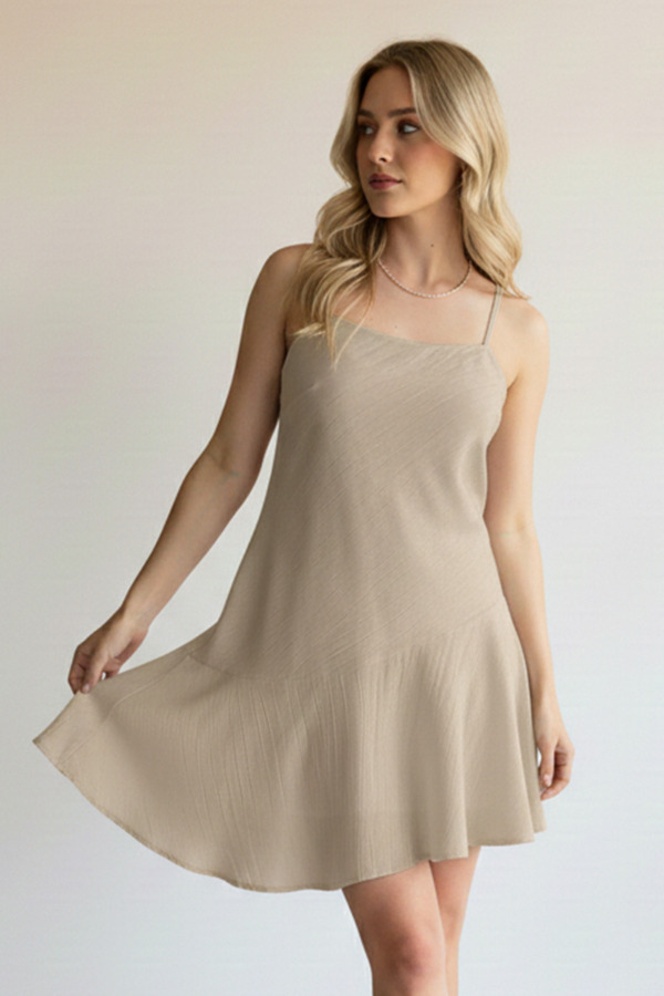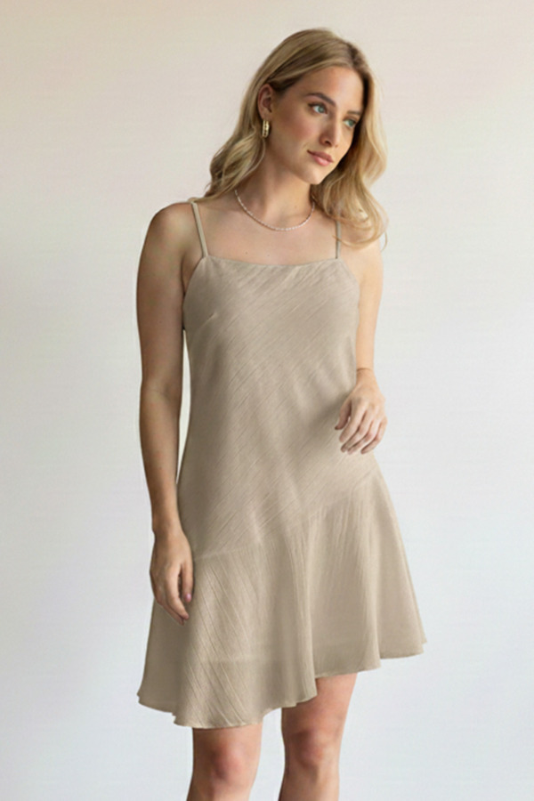 VESTIDO DE BRETELES REGULABLES, ESCOTE RECTO Y RECORTE EN DIRECCION DIAGONAL DE VOLADO CON RUEDO IRREGULAR. BAMBULA DE PUNTO.